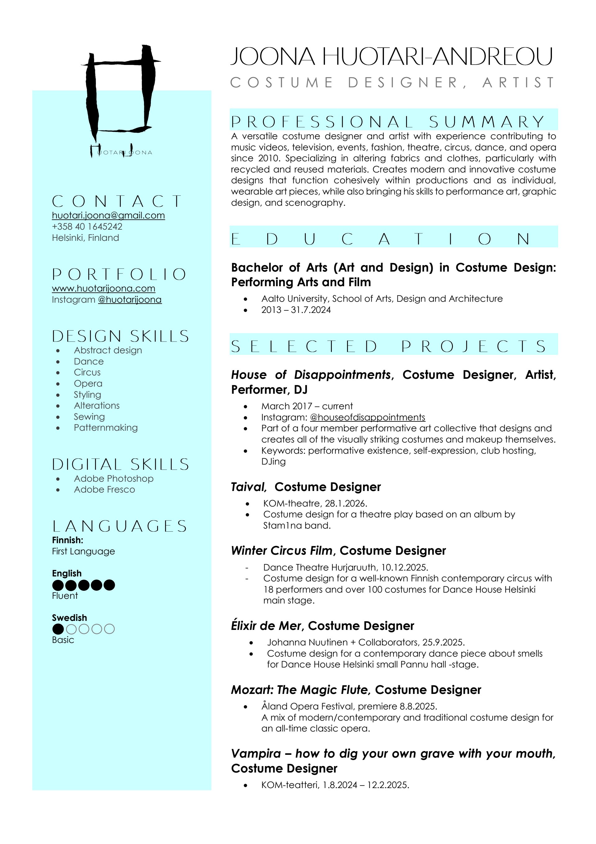 Opinnäyte: Puku itseilmaisun ja performatiivisen olemisen välineenä – House of Disappointments -taidekollektiivi (https://urn.fi/URN:NBN:fi:aalto-202408255580), arvosana 4 (kiitettävä)