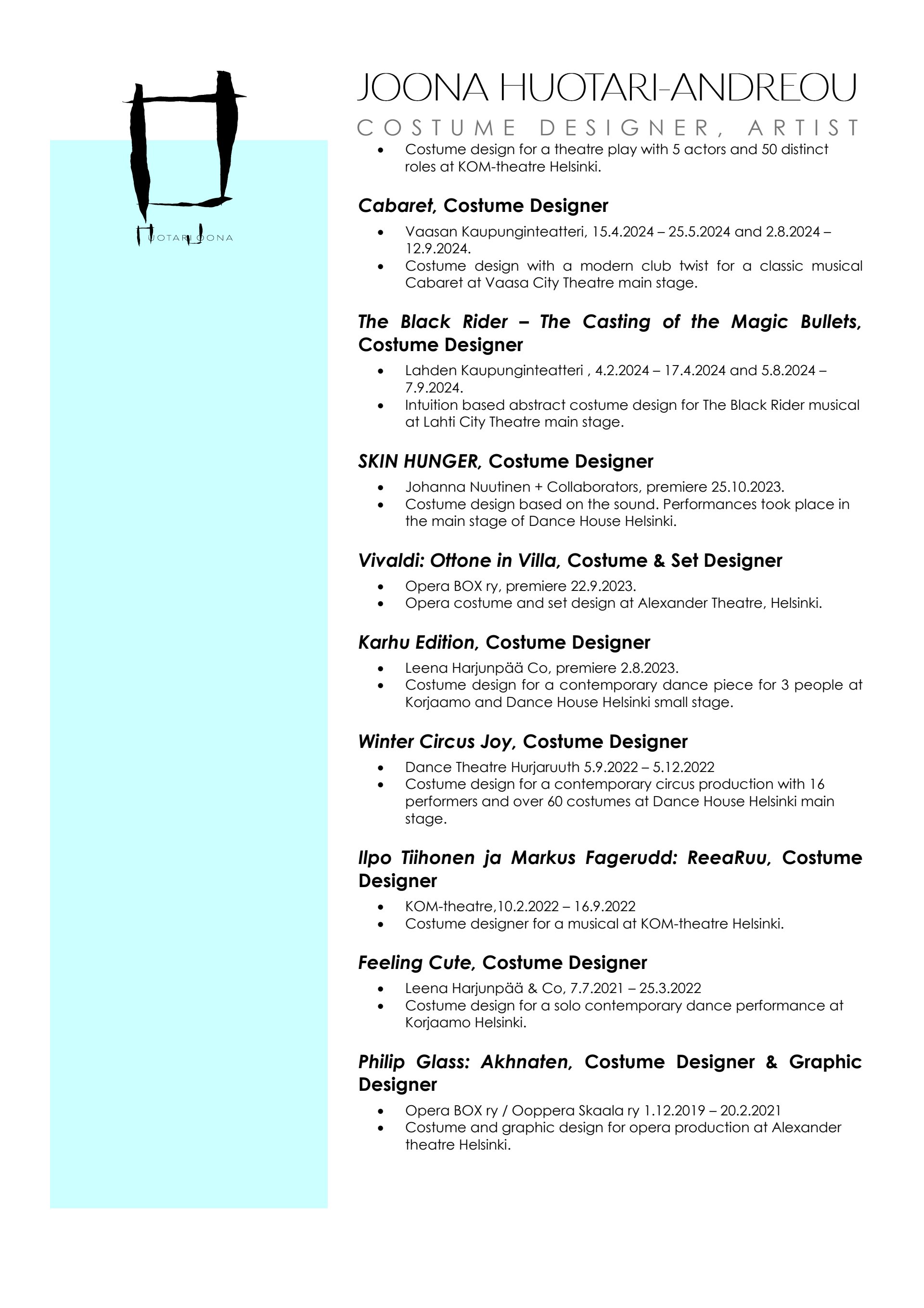 Oy Rabbit Films Ltd, Onnenpyörä VIP, pukusuunnittelija 8.6.2021 – 17.9.2021